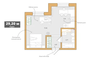 Представляем вам современную квартиру-студию с просторной кухней-гостиной — идеальное решение для тех, кто предпочитает свободное пространство и функциональный интерьер.